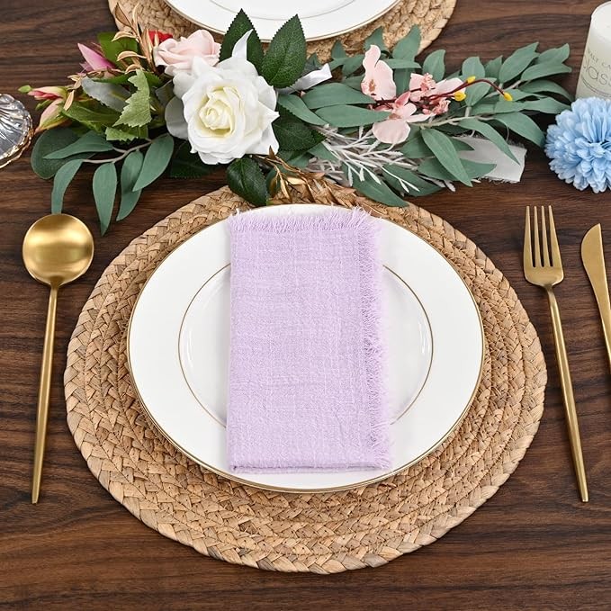 • ?️Napkins Features: Handmade lilac napkins feature a delicate tassel design, edges on all four sides are carefully hand-pulled for an elegant 0.5" fringe, not easy to break and knot, Practical with added elegance, purple napkins always can improve the guest experience very well, making the meal more enjoyable.
