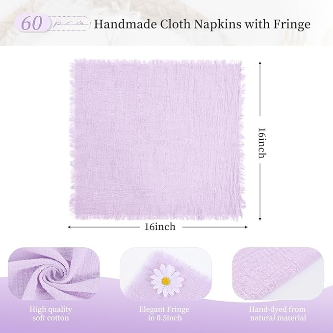 60 Pack Lavender Napkins Cotton Linen Napkins 16 x 16 Inch Lilac Napkins Handmade with Fringe Soft Napkins Cloth Washable Rustic Dinner Napkins Cloth for Wedding Party Dinner Table