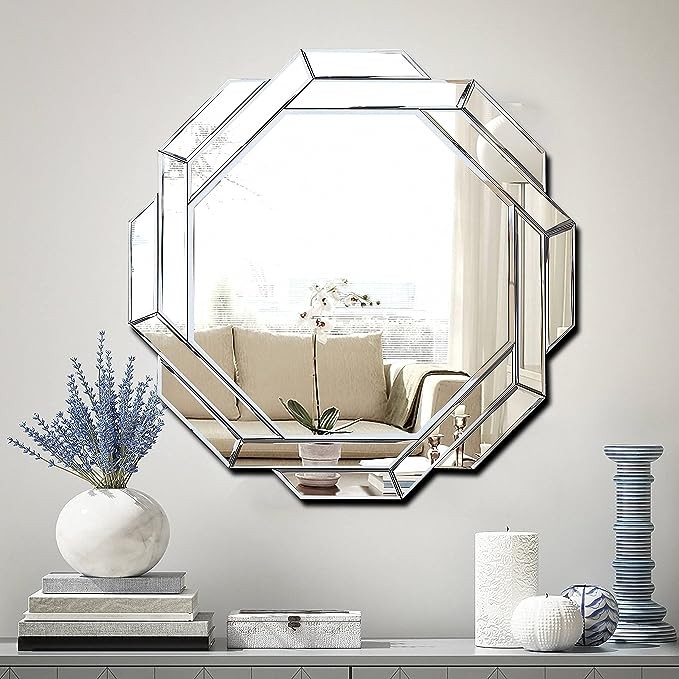 • SOPHISTICATED DESIGN: The decorative mirror is designed with specified small polished slices mirror around the rim.Each edge is carefully beveled. It is sleek, modern and clean in the light.Our solid wood backing design reinforce the product,which is more safety and stable than others.