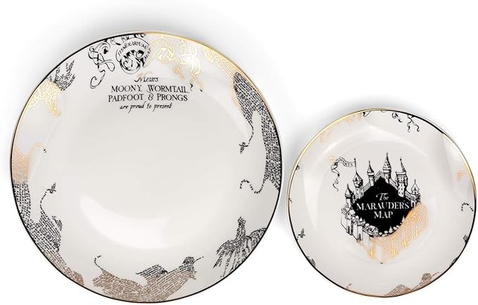 • Moony, Wormtail, Padfoot and Prongs are proud to present this dinnerware set featuring a gold design of the iconic Marauders map based on the Harry Potter books and films!