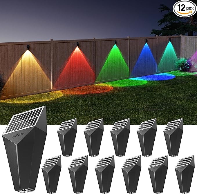 • 【Unique A-Shaped Lighting】Designed by JACKYLED professional lighting engineers, this solar fence lights cast down beautiful A-shaped light cones on your patio fences or wall and ground, adding a touch of welcoming delight to your outdoor backyard. Whether you are playing with your kids or walking the dog, these solar powered deck lights are always standing by to witness your happiness.