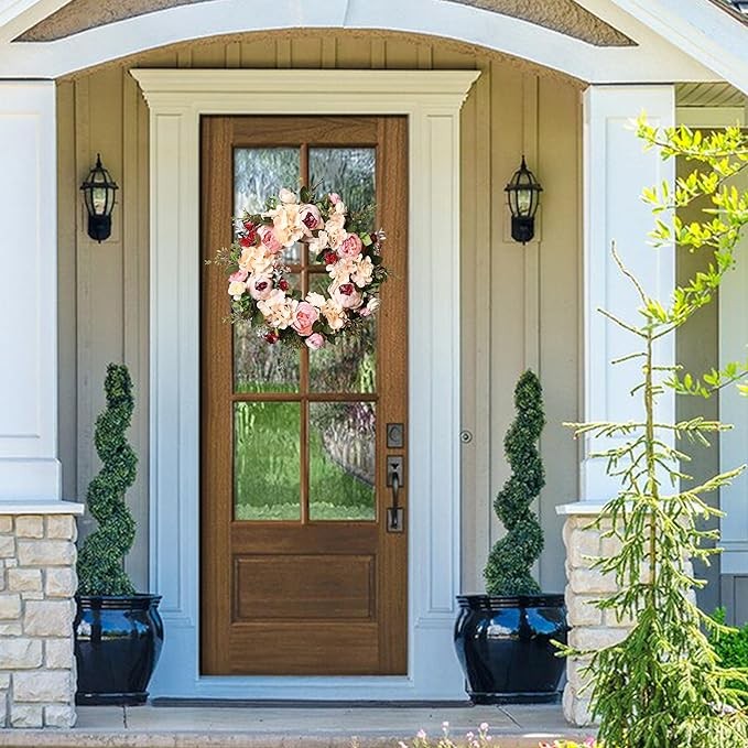 Peony Spring Wreath for Front Door, Handmade Pink Floral Door Wreath Artificial Spring Garland Wreath for Front Door Wall Wedding Party Home Deco
