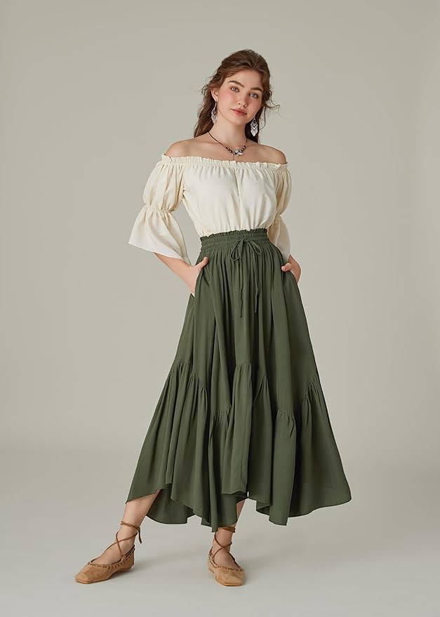 【Match】The Flowy maxi skirt can be worn with a renaissance top, especially a white top that will be a perfect match for stunning photos. Surprisingly It can also be worn with a Renaissance pirate vest, tops shirt,s and shoes to make a Renaissance look.