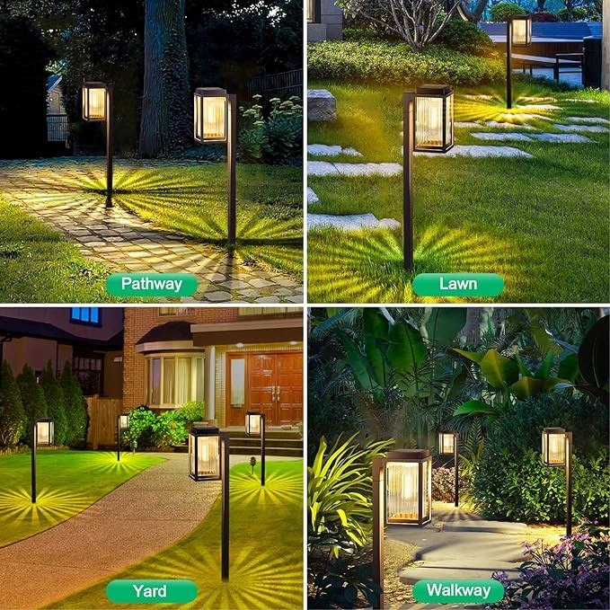 【Durable & Unique Solar Pathway Lights Outdoor】: Upgraded with a modern stripe transparent square shade, filament bulb, and strong stake, our solar landscape lights outdoor are more durable and beautiful. Perfect for pathways, lawns, walkways, and gardens, these pathway lights solar powered provide both lighting and decoration. Enhance your garden's landscape with these outdoor solar lights, lighting up your path home in a unique way.