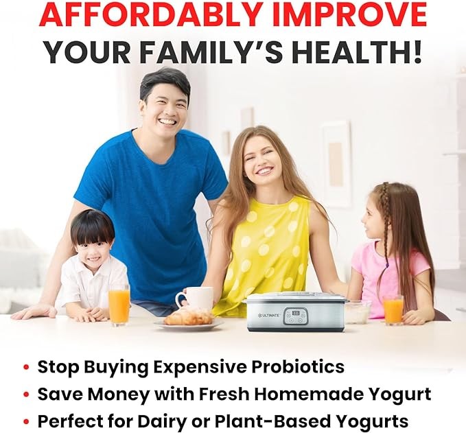 ?YOUR YOGURT, YOUR WAY - Make fresh, delicious and nutritious dairy or dairy-free, vegan yogurt with no additives or sugars! Customize your flavor and texture with different milks, creams, temperatures, cultivation times and probiotics. Then add your own flavors and sweeten to taste! You can also use it as a greek yogurt maker, simply strain your yogurt to the thickness you desire! Experiment with new flavors to make your own Ultimate Yogurt. Best Christmas gifts for healthy friends and family!
