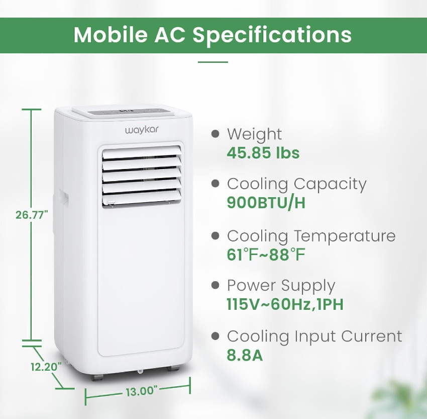 POWERFUL & EFFICIENT COOL AIR CONDITIONER - This Waykar air conditioner features 9,000 BTU cooling power to reduce temperatures between 61°F-88°F for rooms 250-400 sq.ft. It’s the ideal small air conditioner for living rooms, bedrooms, apartments, dorms, offices, cabins, and more.