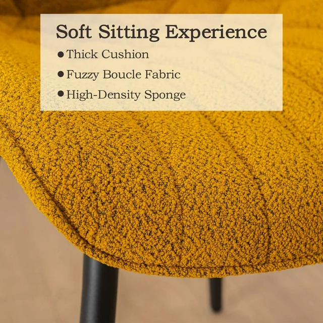 Comfortable--Get ready to experience the comfortable dining chair ever! Our seat, back, and arms are fully loaded with high density foam padding, ensuring you sink into pure comfort. Plus, the touch of our soft boucle dining chair is so amazing, you won't be able to keep your hands off it!